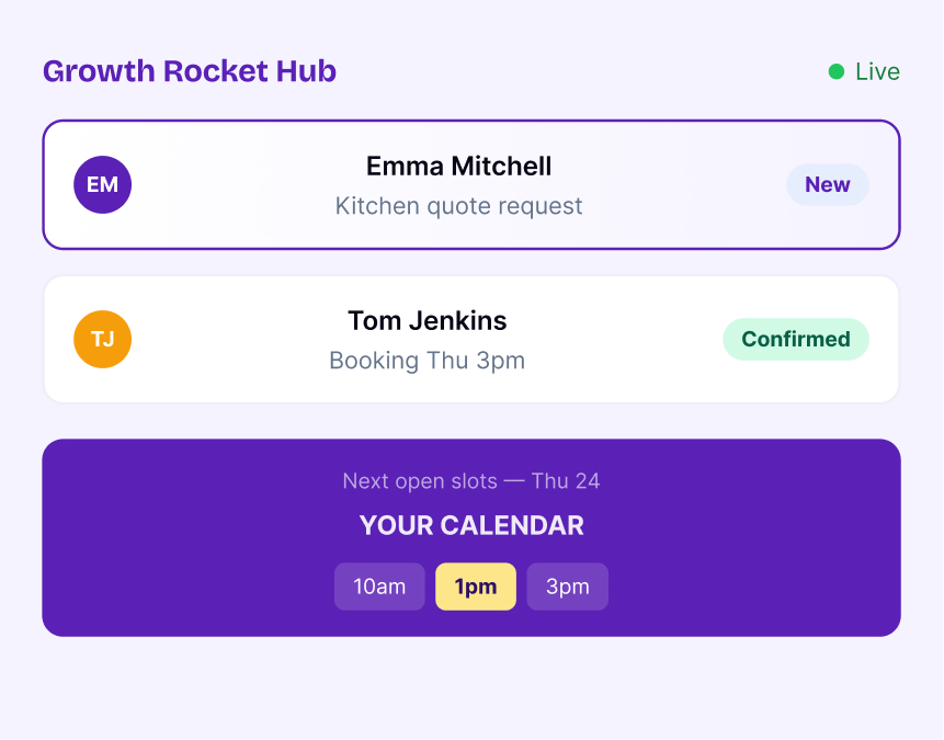 The Growth Rocket Hub brings every enquiry and booking into one organised view. Nothing falls through the cracks.
